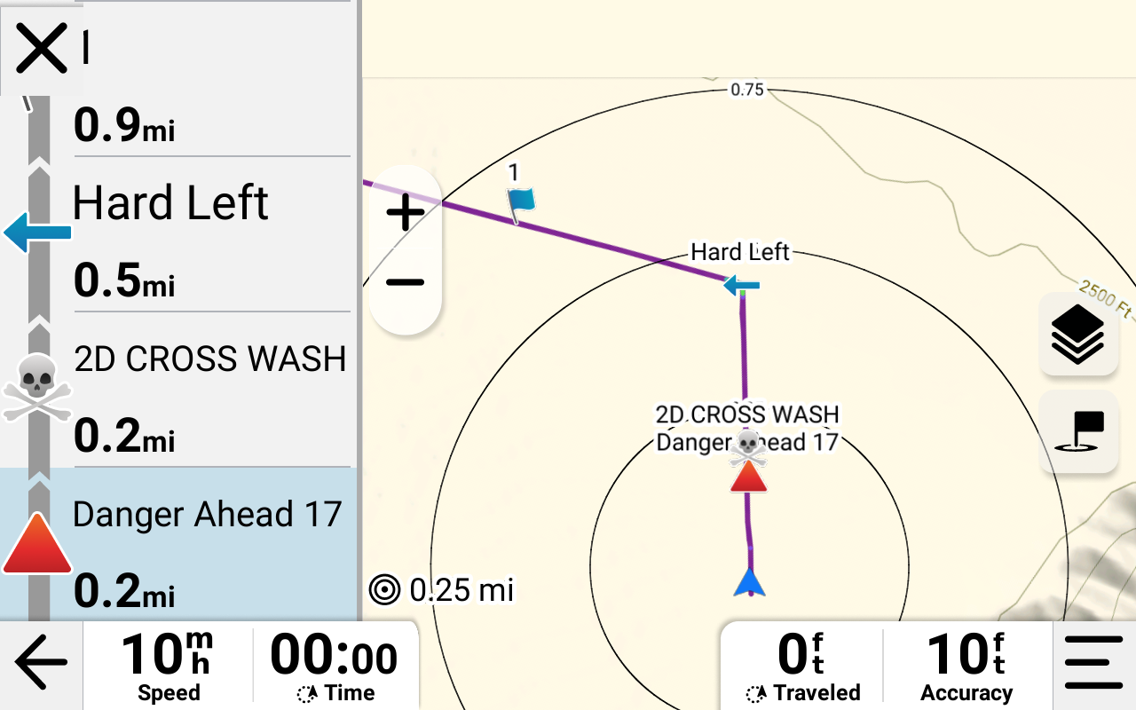 1.5.2.A If the rolling screen of notes shows “No Waypoints Ahead”, you forgot to select a waypoint collection. Go to map layers, pick the right collection, and they should populate automatically. If not, cancel-and-start race mode after selecting the correct collection. That’s a “Fix it while driving” problem.